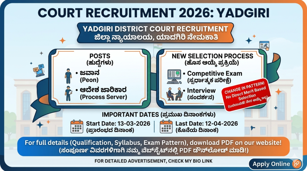 ಉದ್ಯೋಗಕ್ಕಾಗಿ ಕಾಯುತ್ತಿರುವ ಅಭ್ಯರ್ಥಿಗಳಿಗೆ ಮತ್ತೊಂದು ಉತ್ತಮ ಅವಕಾಶ ಲಭ್ಯವಾಗಿದೆ. ಕರ್ನಾಟಕದ Yadgir District Court ಅಡಿಯಲ್ಲಿ ಕಾರ್ಯನಿರ್ವಹಿಸುವ ಪ್ರಧಾನ ಜಿಲ್ಲಾ ಮತ್ತು ಸತ್ರ ನ್ಯಾಯಾಧೀಶರ ಕಚೇರಿಯಲ್ಲಿ ವಿವಿಧ ಹುದ್ದೆಗಳ ಭರ್ತಿಗಾಗಿ ಅರ್ಜಿ ಆಹ್ವಾನಿಸಲಾಗಿದೆ. ಈ ನೇಮಕಾತಿಯ ಮೂಲಕ ಜವಾನ (Peon) ಹಾಗೂ ಆದೇಶ ಜಾರಿಕಾರ (Process Server) ಹುದ್ದೆಗಳನ್ನು ಭರ್ತಿ ಮಾಡಲಾಗುತ್ತದೆ. ಸರ್ಕಾರಿ ನ್ಯಾಯಾಂಗ ಇಲಾಖೆಯಲ್ಲಿ ಕೆಲಸ ಮಾಡಲು ಆಸಕ್ತಿ ಹೊಂದಿರುವ ಅಭ್ಯರ್ಥಿಗಳಿಗೆ ಇದು ಉಪಯುಕ್ತ ಅವಕಾಶವಾಗಬಹುದು. ಅರ್ಹ ಅಭ್ಯರ್ಥಿಗಳು ನಿಗದಿತ ದಿನಾಂಕದೊಳಗೆ ಆನ್‌ಲೈನ್ ಮೂಲಕ ಅರ್ಜಿ