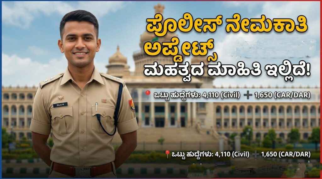 ಕರ್ನಾಟಕದಲ್ಲಿ ಸರ್ಕಾರಿ ಉದ್ಯೋಗಕ್ಕಾಗಿ ತಯಾರಿ ನಡೆಸುತ್ತಿರುವ ಅಭ್ಯರ್ಥಿಗಳಿಗೆ ಪ್ರಮುಖ ಮಾಹಿತಿ ಹೊರಬಿದ್ದಿದೆ. ರಾಜ್ಯ ಪೊಲೀಸ್ ಇಲಾಖೆಯಲ್ಲಿ Civil Police Constable (CPC) ಹಾಗೂ CAR/DAR Police Constable ಹುದ್ದೆಗಳ ನೇಮಕಾತಿಗೆ ಸಂಬಂಧಿಸಿದಂತೆ ಹೊಸ ಅಪ್ಡೇಟ್‌ಗಳು ಪ್ರಕಟವಾಗಿವೆ. ಇತ್ತೀಚಿನ ಮಾಹಿತಿಯ ಪ್ರಕಾರ ಒಟ್ಟು ಸಾವಿರಾರು ಹುದ್ದೆಗಳ ನೇಮಕಾತಿಗೆ ಪ್ರಕ್ರಿಯೆ ನಡೆಯುವ ಸಾಧ್ಯತೆ ಇದೆ. ಪೊಲೀಸ್ ಇಲಾಖೆಯಲ್ಲಿ ಕೆಲಸ ಮಾಡಲು ಆಸಕ್ತಿ ಹೊಂದಿರುವ ಯುವಕರಿಗೆ ಇದು ಉತ್ತಮ ಅವಕಾಶವಾಗಬಹುದು. ಹುದ್ದೆಗಳ ವಿವರ ಲಭ್ಯವಿರುವ ಮಾಹಿತಿಯ ಪ್ರಕಾರ ಪೊಲೀಸ್ ಇಲಾಖೆಯಲ್ಲಿ ಕೆಳಗಿನ ಹುದ್ದೆಗಳ ನೇಮಕಾತಿ ನಿರೀಕ್ಷಿಸಲಾಗಿದೆ: ಒಟ್ಟು 5,760 […]